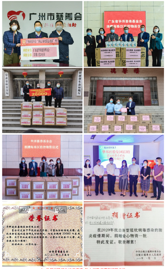 2020年,疫情突如其来,华邦在做好企业防控工作的同时,积极筹措抗疫关键物资,通过华邦慈善基金会,甘肃省慈善总会先后捐赠医用口罩,以及红外线测温仪、医用防护服等抗疫物资,助力打赢疫情防控阻击战。