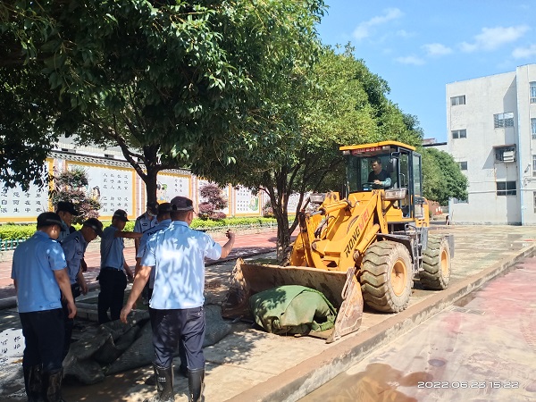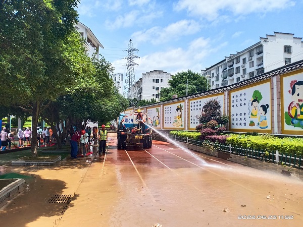 在恭城,灌平七标组织铲车、洒水车帮助恭城第三小学清理垃圾、清洗校园,让孩子们尽快回到课堂。