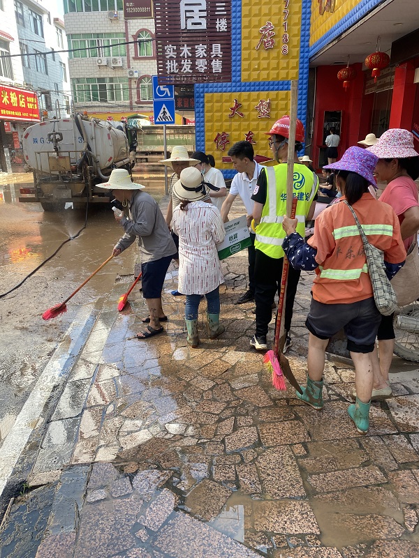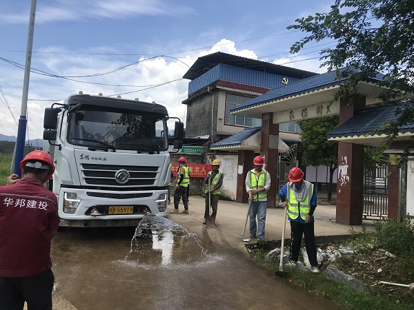 在平乐县,灌平八标组织铲车、洒水车协助清理街道淤泥、垃圾、清洗路面,挥舞着手中的工具,让大家看到了华邦建设者的精气神,看到了华邦的社会责任与担当。