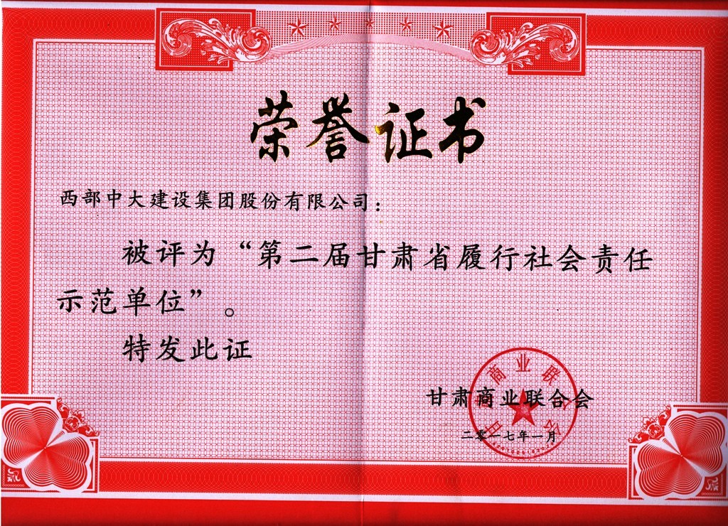 西部中大建设集团荣获“甘肃省履行社会责任示范单位”荣誉称号