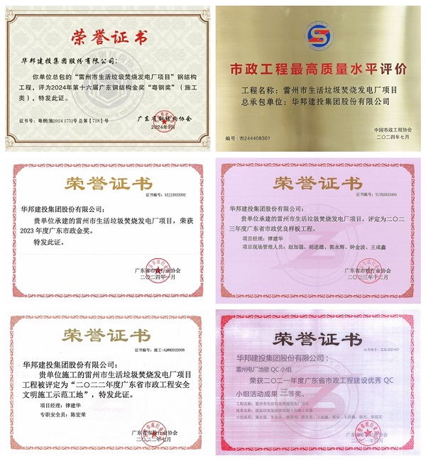 作为广东市场代表项目,WilliamHill中文官方网站集团雷州市生活垃圾焚烧发电厂项目(以下简称:雷州电厂)始终坚持以高标准、严要求进行施工,努力做到项目管理专业化、工程施工标准化、日常管理精细化、管理手段信息化、发展理念人本化,不断推动工程质量管理水平的提升。因质量上乘,雷州电厂项目荣获2024年第十六届广东钢结构金奖“粤钢奖”、2024年度市政工程最高质量水平评价、2023年度广东市政金奖、2023年度“广东省市政优良样板工程”称号、2022年度“广东省市政工程安全文明施工示范工地”称号、广东省市政工程建设优秀QC小组活动成果三等奖等荣誉。