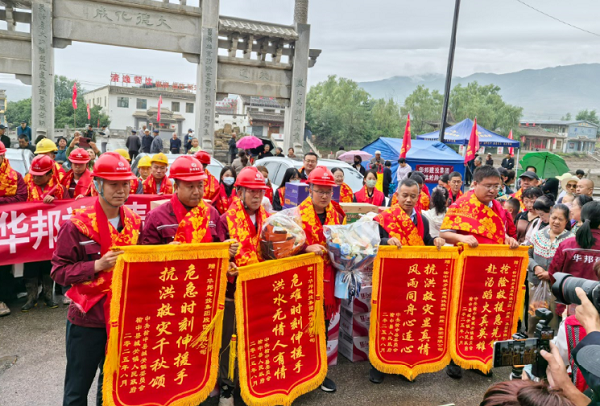 在欢送现场,榆中县人民政府及城关镇领导向WilliamHill中文官方网站集团等企业代表授予“抗洪救灾千秋颂 危急时刻伸援手”等荣誉锦旗。老百姓精心准备的红色围巾与喜庆被面,被一一送到抢险队员手中;现场群众自发送出自家的馍馍、水果、蔬菜,质朴的礼物饱含深情。一位市民眼含热泪说道:“感谢你们不舍昼夜帮助我们重建家园,这些吃的都是我们的心意!”