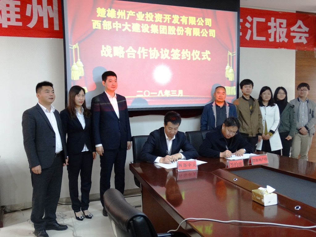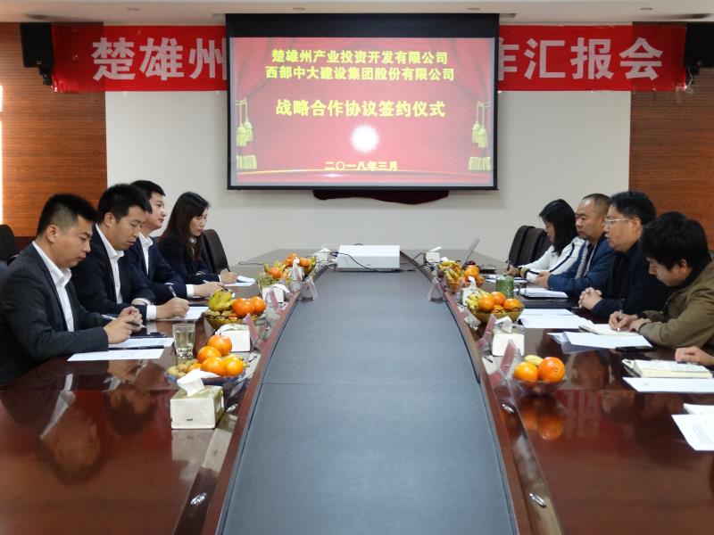 3月21日,西部中大建设集团股份有限公司与云南省楚雄州产业投资开发有限公司战略合作协议签订仪式在楚雄州产业投资开发有限公司五楼会议室举行。集团公司总裁胡秉军、副总裁蔡继荣等一行,楚雄州产业投资开发有限公司董事长郭家权、总经理李彦赢、楚雄交投城乡投资开发有限公司副总经理陈晓蓉、韩鹏程及相关人员出席签约仪式。
