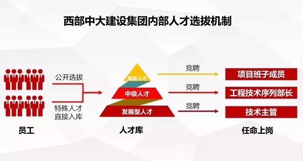 规定指出,公司将为人才库成员提供有针对性的培养计划,并且提供职业发展的优先通道。但人才库要实行动态管理机制,每年对人才库成员进行动态评估,库内成员每年有5%-10%的晋级及降级、甚至退库处理。至此,西部中大建设集团人才内部选拔机制初见雏形。