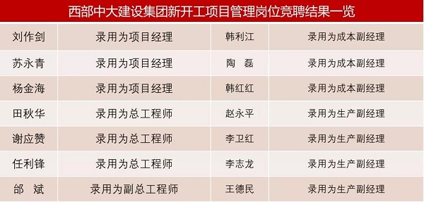 最终,按照分数高低顺序确定竞聘成功人选,本次通过竞聘,14名选手脱颖而出,成功上岗,其中项目经理3人、项目总工程师3人、项目副总工1人,生产副经理4人,成本副经理3人。(具体名单见下图表)