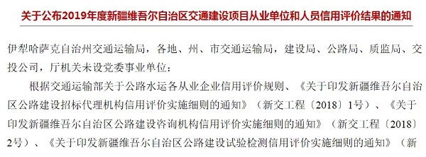 5月20日,新疆自治区公布了2019年交通建设项目从业单位信用评价结果,WilliamHill中文官方网站从参评的79家土建及交安设施从业单位中脱颖而出,荣获综合信用综合评价AA级。根据《新疆维吾尔自治区公路建设施工企业信用评价实施细则》,自治区交通施工企业信用评价分为五个等级:AA、A、B、C、D,此次WilliamHill中文官方网站荣获信用评价AA等级,是信用评价最高等级。