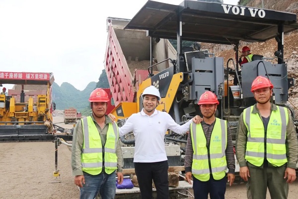 在现场,苏如春登上摊铺机,现场气氛高涨,他指着摊铺机上的标语“造千座隧道,铺万里坦途”说:“这是我08年题写的标语,没想到兄弟们还记得”。随后,他与项目一线施工管理人员和施工人员一起合影留念,高呼“华邦,生日快乐”,共庆华邦成立20周年。