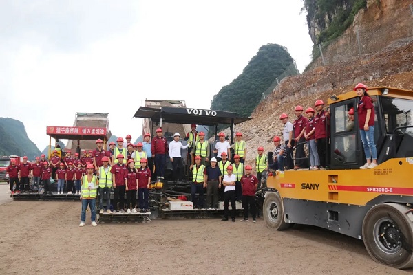 在桂柳路面施工现场,摊铺机、拉料车、压路机、挖机来回穿梭,施工人员正在利用暴雨前晴好天气抢抓施工进度,工地上一片热火朝天的繁忙景象。苏如春来到现场,鼓励大家齐心协力,鼓足干劲,统一思想,坚定目标,确保桂柳项目如期通车。
