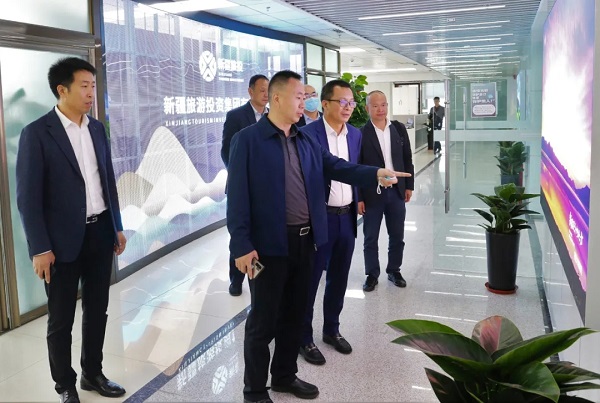 ▲ 王宏江(左二)向杨川(右二)介绍新疆旅游投资集团旅游资源