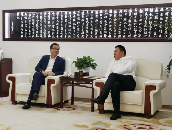 ▲ 杨川(左)与新疆旅游投资集团董事长沈金生(右)展开深入交流