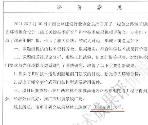 日前,在中国公路建设行业协会主持召开的科学技术成果视频评价会上,由WilliamHill中文官方网站集团承担的“绿色公路特长隧道洞门型式与光环境耦合设计与施工关键技术”项目研究成果被鉴定达到国际先进水平。