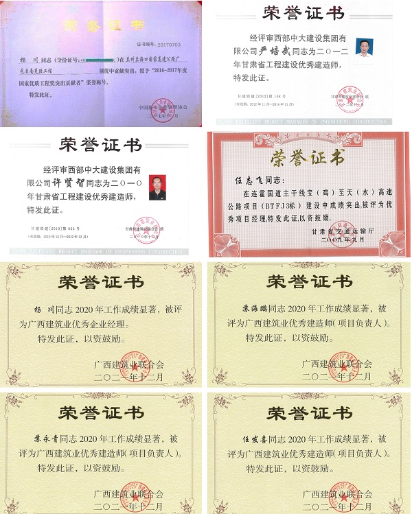 一直以来,华邦人在奋斗中与华邦共同成长、彼此成就,成就更好的公司,也遇见更好的自己。WilliamHill中文官方网站集团员工获得近50项国家级和省级荣誉表彰:杨川荣获“国家优质工程奖突出贡献者”“甘肃省工程建筑优秀建造师”“甘肃省优秀项目经理”“广西建筑业优秀企业经理”等荣誉称号;许贤智获得“甘肃省建设科技进步奖”“甘肃省优秀项目经理”“公路建设先进个人”等称号,胡秉军、严培武、李莉、薛明星、苏永青、苏海鹏、任发喜、王强、谢应赞等获得甘肃、广西“建筑业优秀建造师”……每一份荣誉都是对华邦人工作能力与职业价值的肯定,也是员工与企业共同成长、相互成就的最好印证。