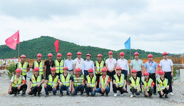 苏如春在灌平高速班山尾大桥现场与一线员工合影留念