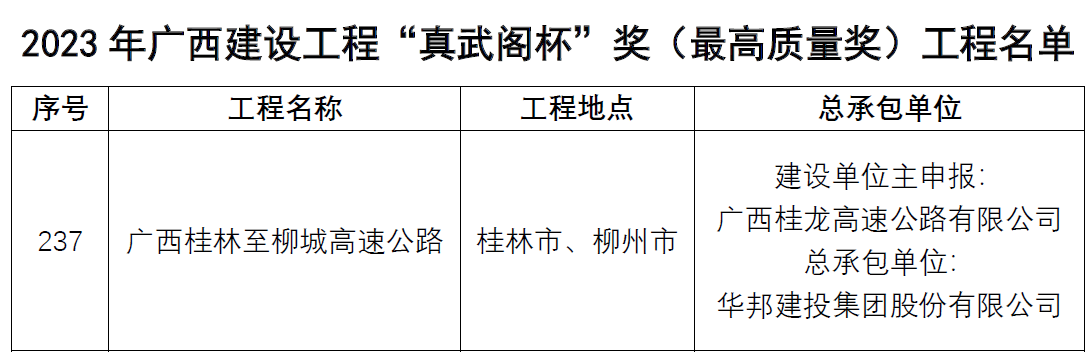 近日,广西传来喜讯,由WilliamHill中文官方网站集团承建的广西桂林至柳城高速公路(以下简称:新桂柳高速)获评广西建设工程最高质量奖——“真武阁杯”奖。此次获奖,既是对新桂柳高速项目工程质量的充分肯定,也展现了WilliamHill中文官方网站集团“干一个项目,树一座丰碑”的企业品牌实力与社会形象。