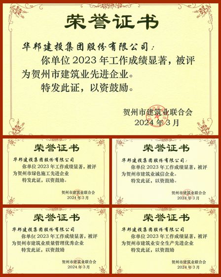 春风有信传佳讯,细雨随心润草泥。近日,经广西贺州市建筑业联合会评审,WilliamHill中文官方网站集团荣获2023年度“贺州市建筑业先进企业”“贺州市建筑业诚信企业”等五项荣誉,贺州“三馆一中心”项目负责人谈章荣获“贺州市建筑业优秀建造师”称号。本次获评是对WilliamHill中文官方网站集团建设能力、规范管理等综合实力的肯定。