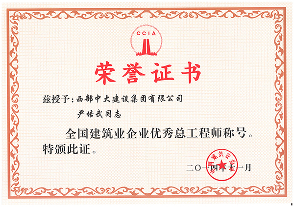 为弘扬建筑业企业总工程师在科技进步和管理创新工作中的奉献精神,进一步推动建筑业持续健康发展,中国建筑业协会开展了“全国建筑业企业优秀总工程师” 评选活动,西部中大集团公司总工程师严培武获得 2014年“全国建筑业企业优秀总工程师”称号。