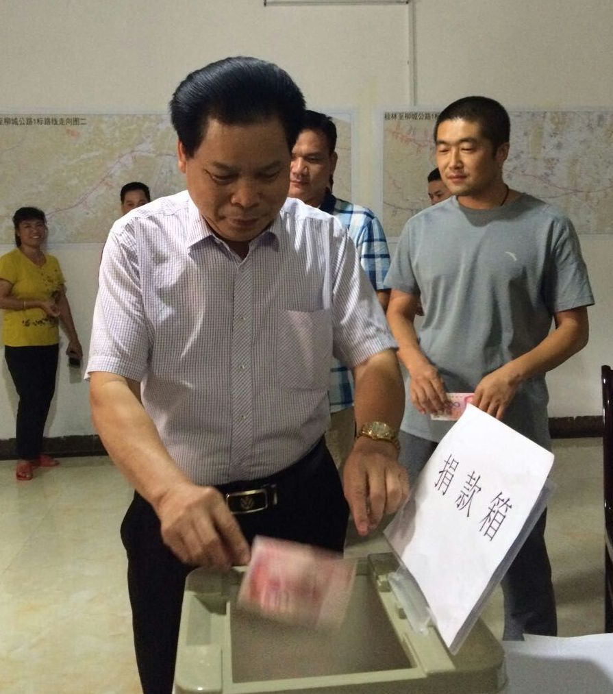 符安林(中)在集团公司南宁总部接受全全体员工捐款