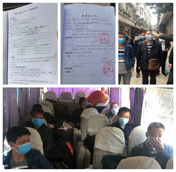2月24日清晨,春风和煦,阳光明媚。在广西壮族自治区桂林市全州县,11名工人在接受体检和防疫宣贯教育,填好《复工人员一人一档信息登记表》后,登上返岗大巴,踏上远行旅程。他们此行目的地是200公里外的桂柳三标项目部驻地百寿镇,不出差错,4个小时后,他们将重返施工工地,开始一年的工作。