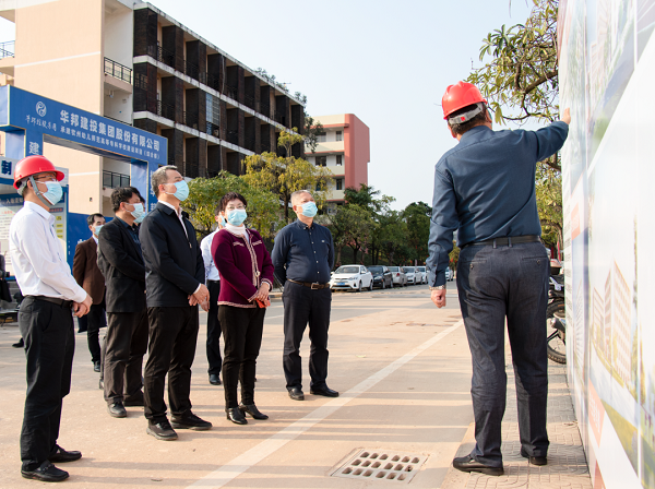 在项目现场,曾智一行通过实地考察、听取汇报等方式详细了解项目总体施工安排及进展情况。曾智对项目工作给予充分肯定,他指出,钦州幼专项目是完善广西高等教育结构的关键一环,各参建单位要全力以赴,在确保安全、质量的前提下,如期完成施工任务,谱写钦州民生事业发展新篇章。