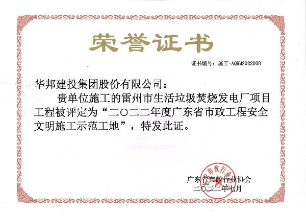 “湛江市房屋市政工程安全生产文明施工示范工地”称号,