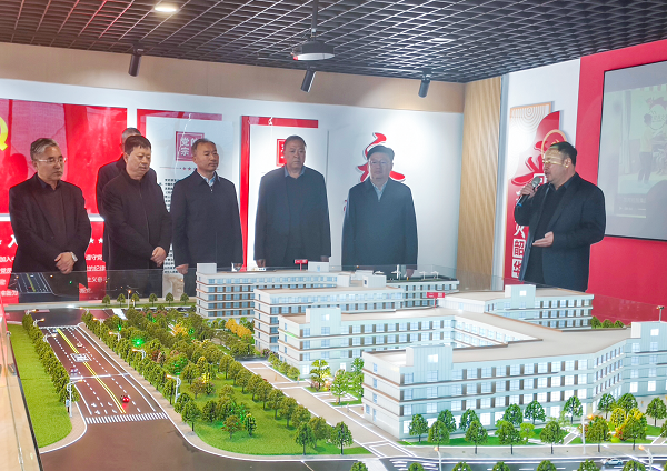 李明(右三)在平凉养护院项目沙盘前听取建设情况汇报